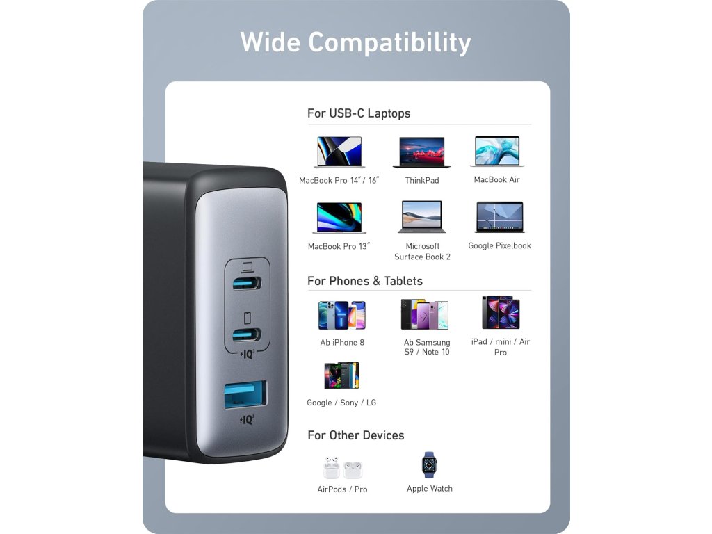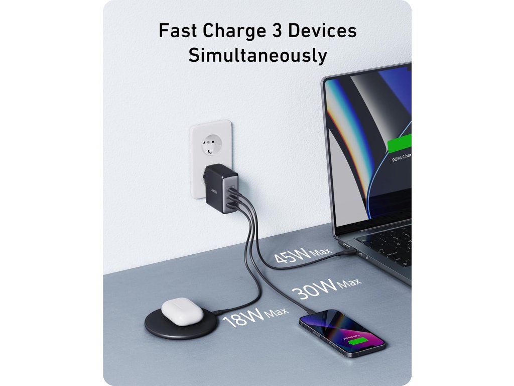 Anker Powerport Nano II se svými 100W umožňuje nabíjet hned 3 zařízení najednou: Nabíjejte MacBook, iPhone 15 a AirPods současně.