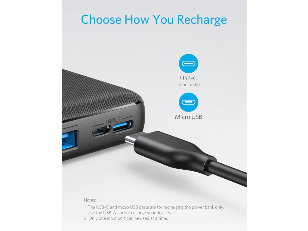 Tento nový model nabízí 2 vstupy pro nabíjení powerbanky: kromě běžného micro USB je zde přítomen také USB-C vstupní konektor. Nemusíte se tak již bát, že nebudete mít kompatibilní kabel pro nabití powerbanky.