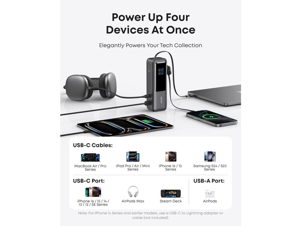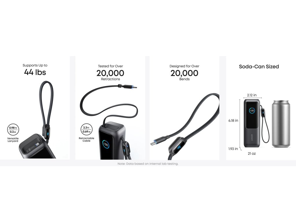 Výkon 100 Wattů umožňuje nabít například MacBook Pro M3 z 0% na 50% za pouhých 33 minut, stejně tak MacBook Air. iPhone 16 se s powerbankou Anker 25k 165W nabije na 50% dokonce již za 25 minut a Samsung S24 za 28 minut.