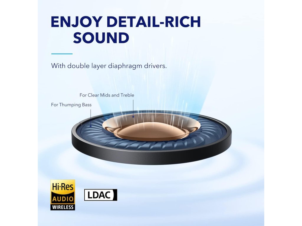 Vysoce detailní zvuk: Díky průkopnickým dvouvrstvým membránovým měničům Soundcore produkují sluchátka Space A40 s potlačením hluku zvuk se silnými basy, čistými středy a jasnými výškami. Můžete také poslouchat v režimu LDAC pro bezdrátový zvuk ve vysokém rozlišení.