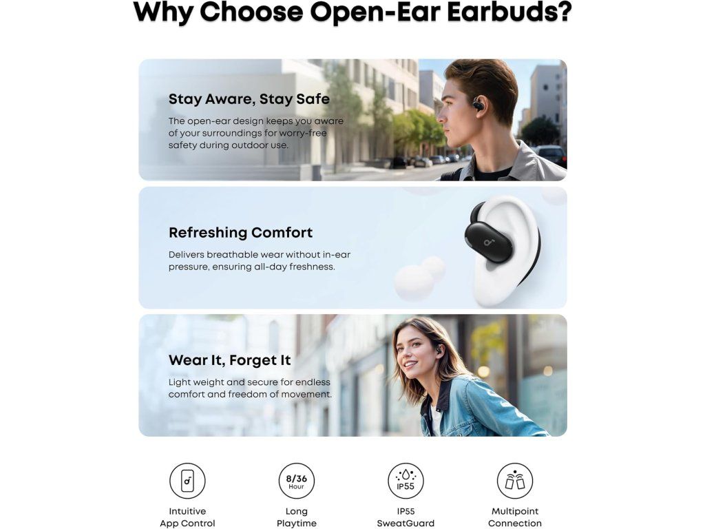 - Vylepšené povědomí o okolním prostředí: Se sluchátky V20i Open-Ear Earbuds můžete zůstat v kontaktu s vnějším světem a zároveň si užívat prémiový zvuk. Jsou ideální pro městský život a outdoorové aktivity. Poznámka: Otevřená sluchátka V20i nemají aktivní potlačení hluku.