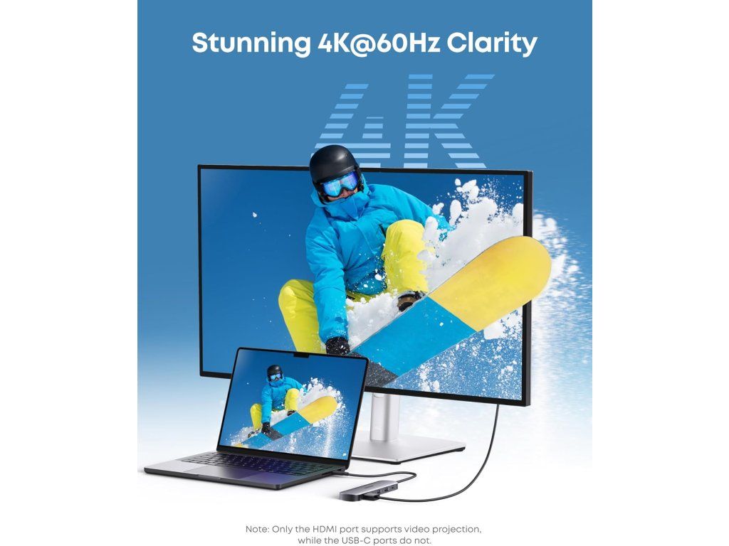 - Křišťálově čisté 4K@60Hz HDMI: Vychutnejte si kvalitu obrazu ostrého jako břitva a plynulé přehrávání – ideální pro prezentace nebo zábavu ve vysokém rozlišení. (Poznámka: Výstup videa podporuje pouze port HDMI; port USB-C slouží pouze pro přenos dat.)