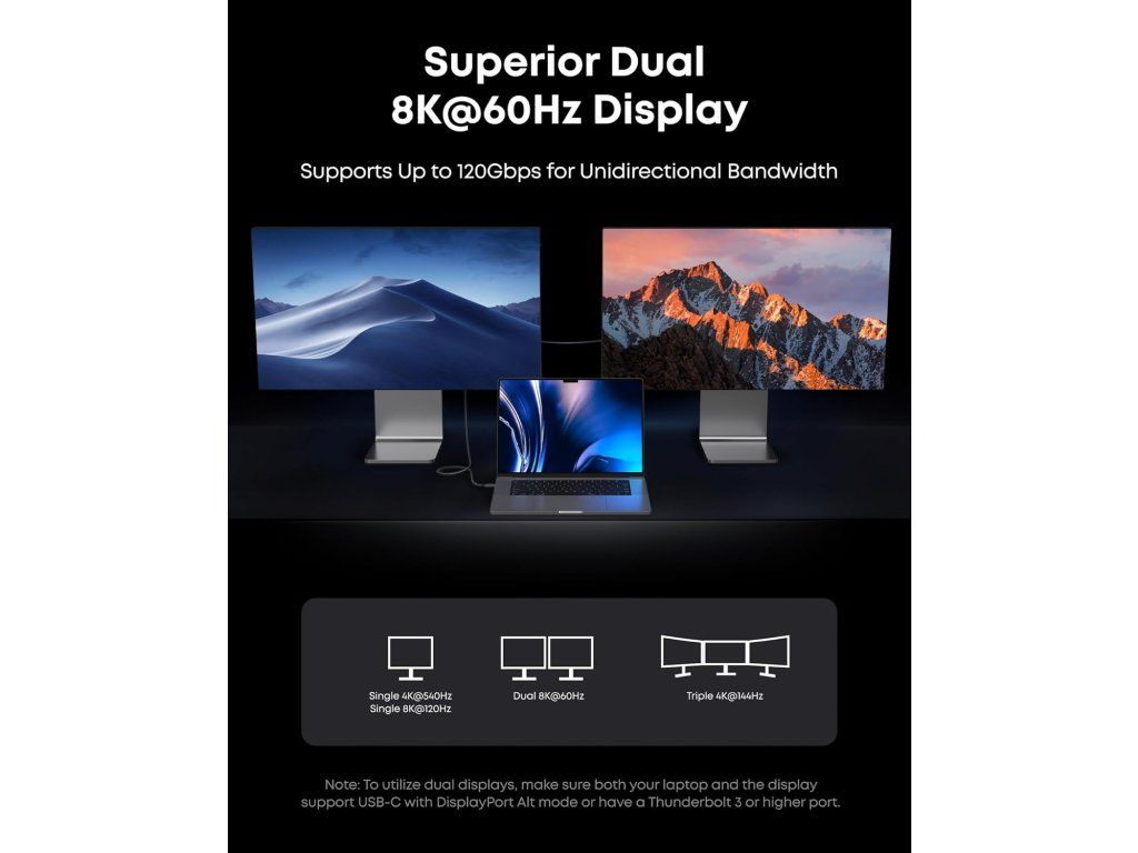 - Podpora 8K displeje: Užijte si působivou čistotu se dvěma 8K displeji při 60 Hz a šířce pásma až 120 Gb/s.